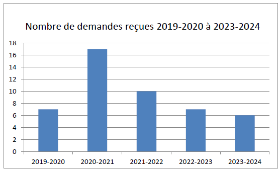 Le graphique ci-dessous démontre, pour les années 2019-2020 à 2023-2024, le nombre de demandes d'accès à l'information que la Commission a traitées chaque année. En 2020-2021, le nombre de demandes a augmenté de manière significative par rapport à 2019-2020. En 2021-2022, 2022-2023 et 2023-2024, le nombre de demandes a de nouveau diminué.