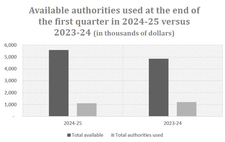 The Statement of Authorities below shows that the Commission spent approximately 20% of its authorities in the first quarter of 2024-25 compared to 25% in 2023-24. Similarly, the Commission’s total budgetary expenditures decreased by $97,000 in the first quarter of 2024-25, compared to the same period in 2023-24. This variance is mostly explained by a decrease in the following areas: