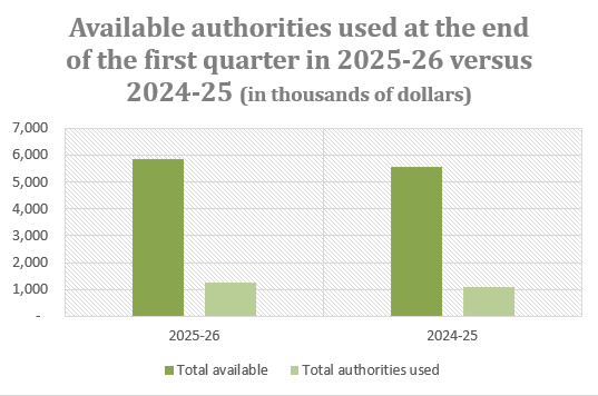 The following graph shows the total available authorities and total authorities used in 2025-26 compared to 2024-25.